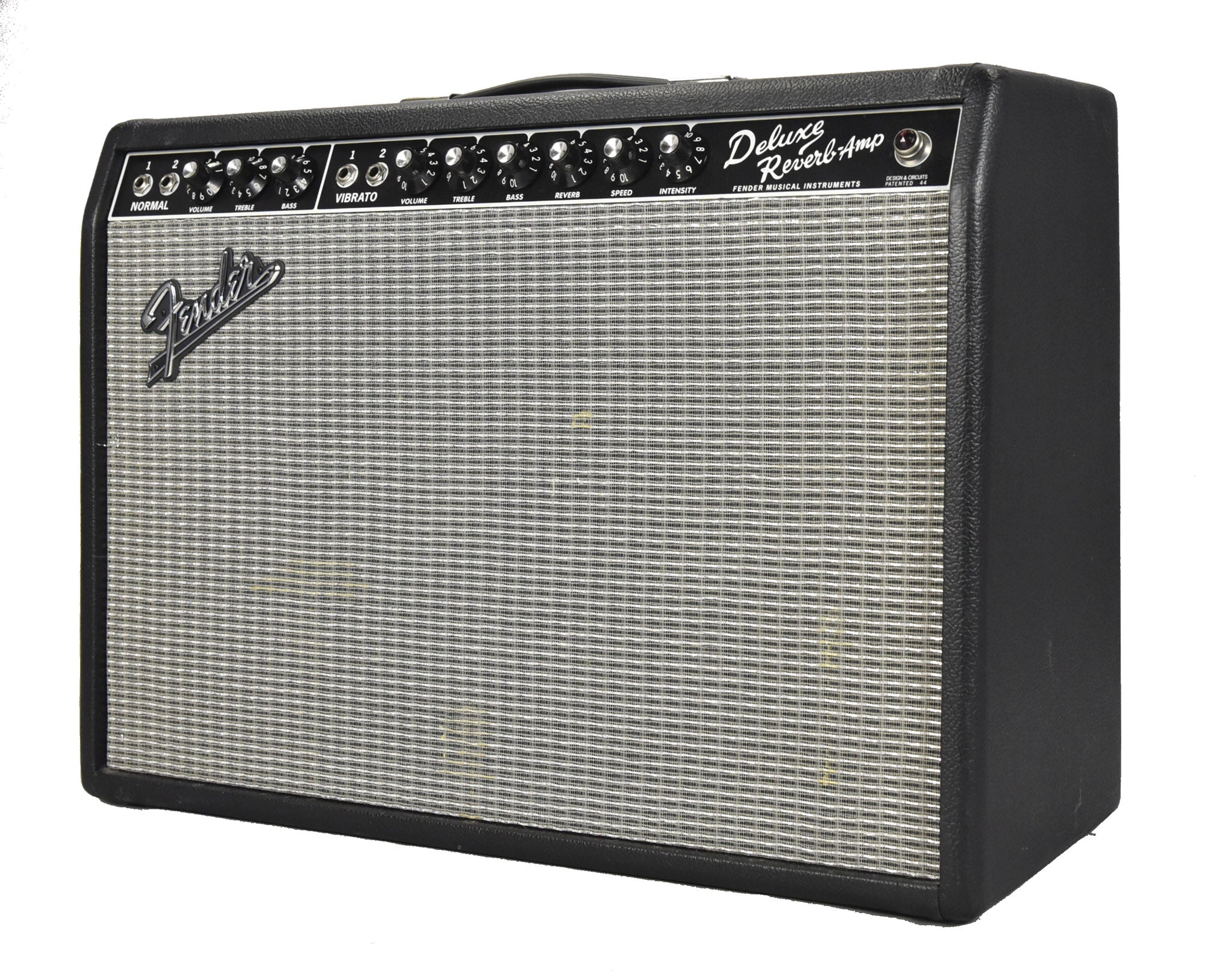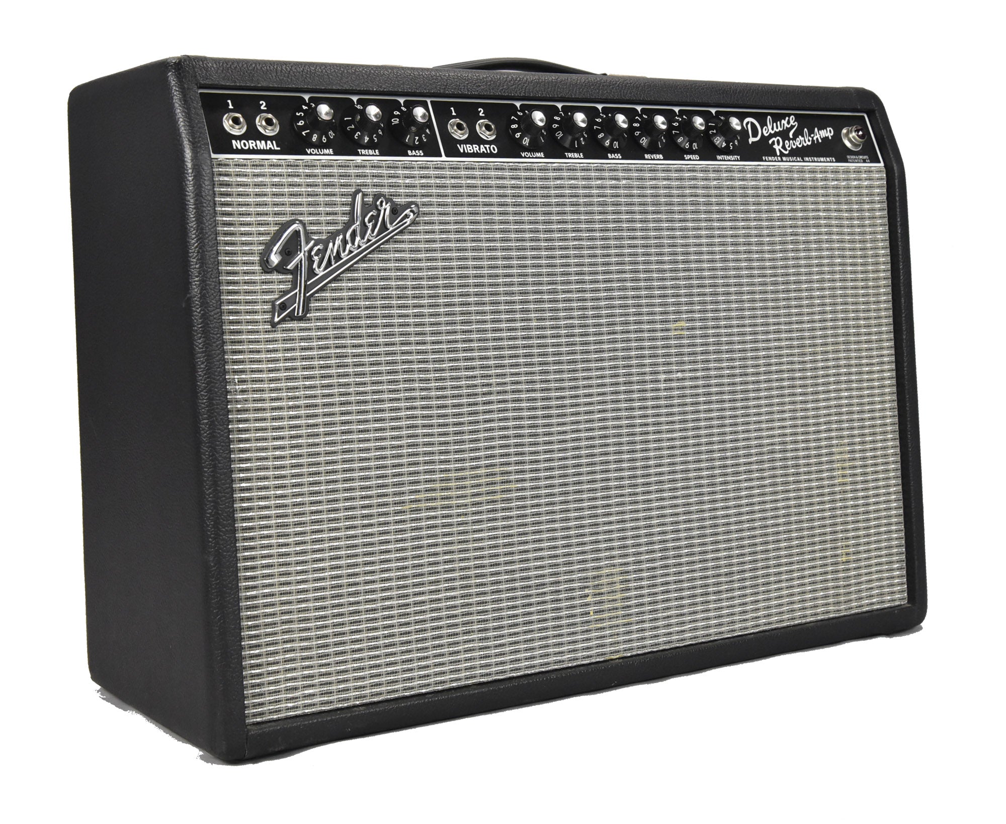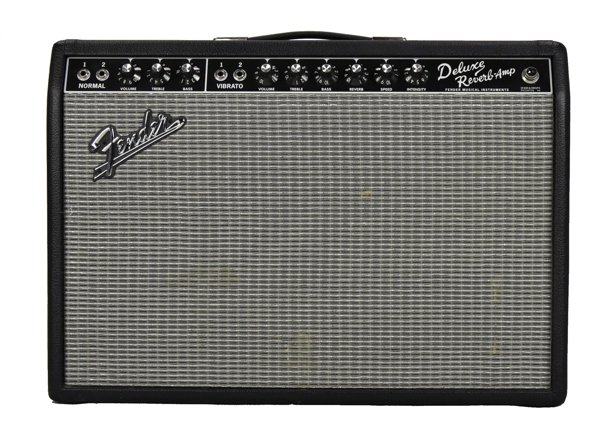 The 22-watt '65 Deluxe Reverb® amp is for rock, country, or blues players who want a moderately powered amp they can crank up at the gig or in the studio. The full, snappy guitar tones heard on many famous recordings from Memphis to Abbey Road were made using the Deluxe™ amp. Features include dual 6V6 Groove Tubes® output tubes, one 5AR4 rectifier tube, four 12AX7 preamp tubes, two 12AT7 tubes, one 12" 8-ohm Jensen® C-12K speaker, dual channels (normal and vibrato), tube-driven Fender® reverb, tube vibrato, two-button footswitch for reverb and vibrato on-off, black textured vinyl covering and silver grille cloth.