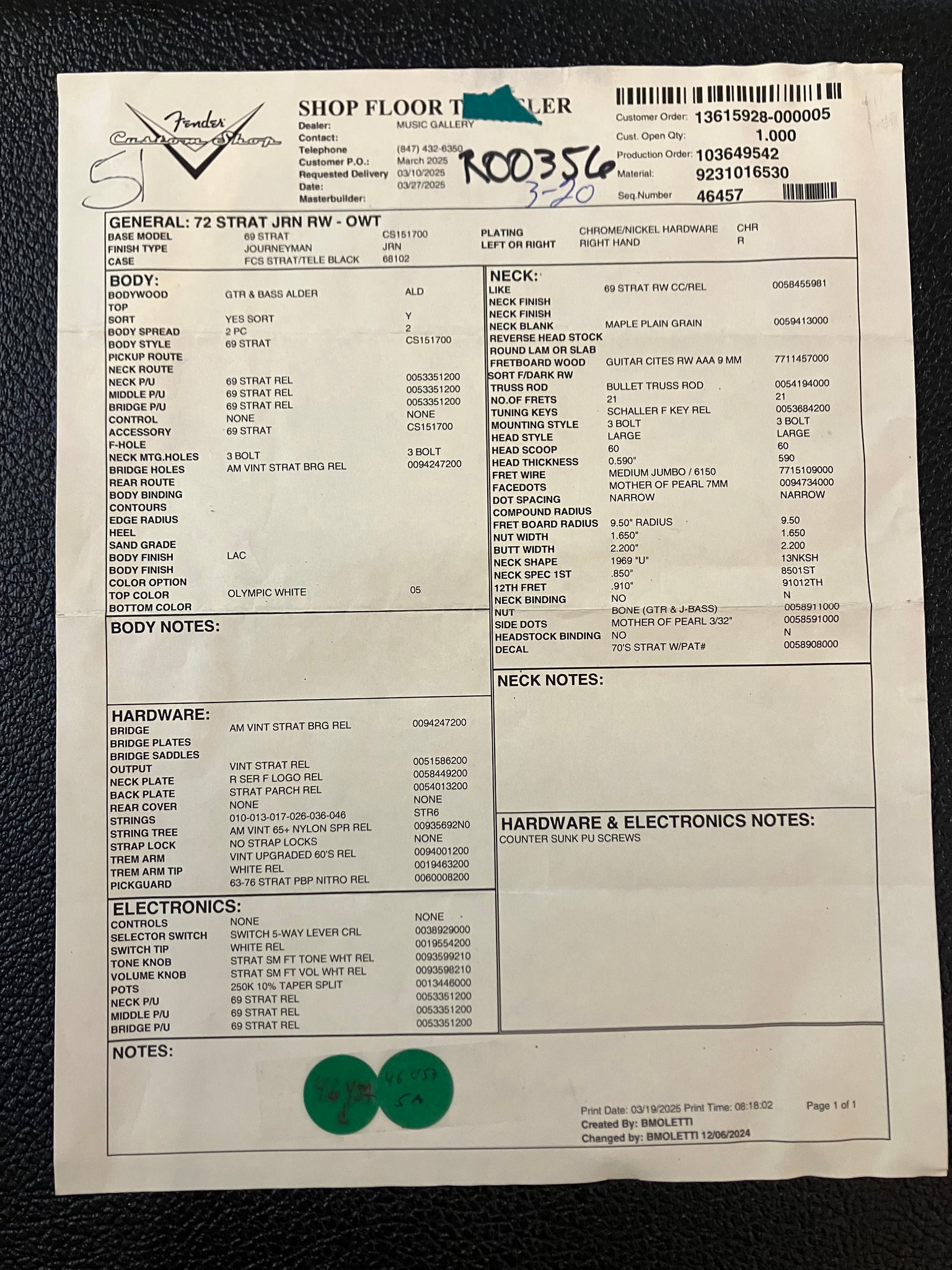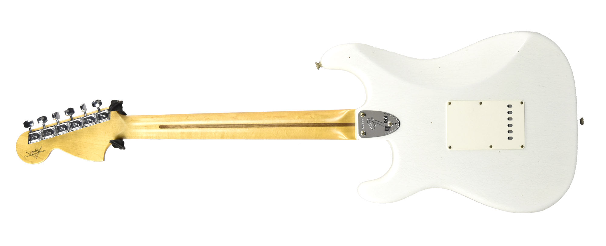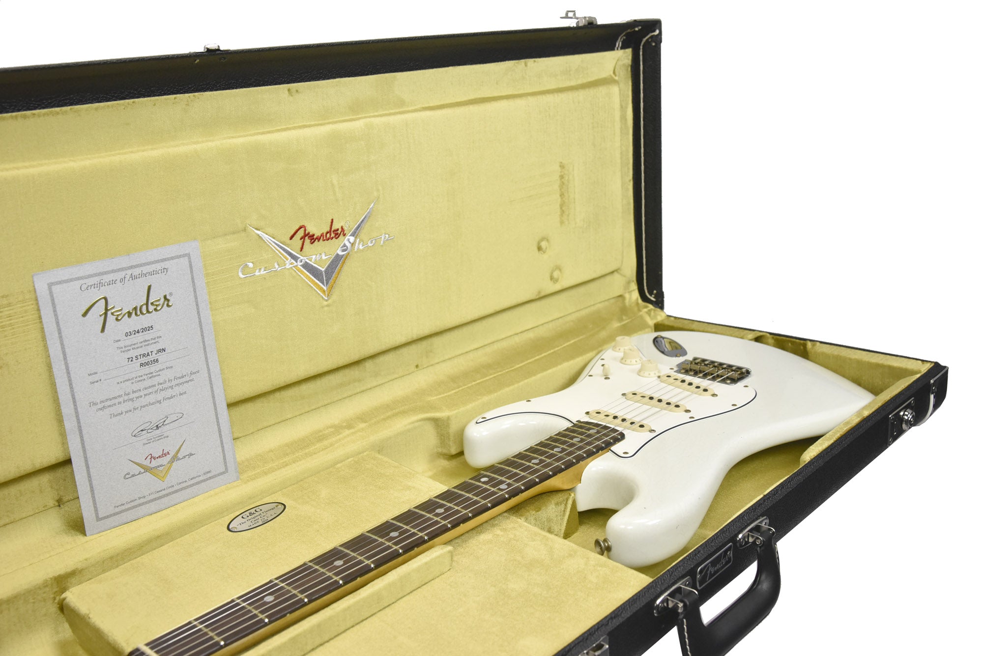 This Fender Custom Shop 72 Stratocaster Journeyman Relic in Olympic White is brand new and weighs 7 lbs 14 oz. This is a beautiful guitar with an Alder Body, 3-Color Sunburst, and a Journeyman Relic level of distressing. The Large Headstock and "Bullet" Truss Rod Adjustment behind the nut absolutely screams 70s Strat!
