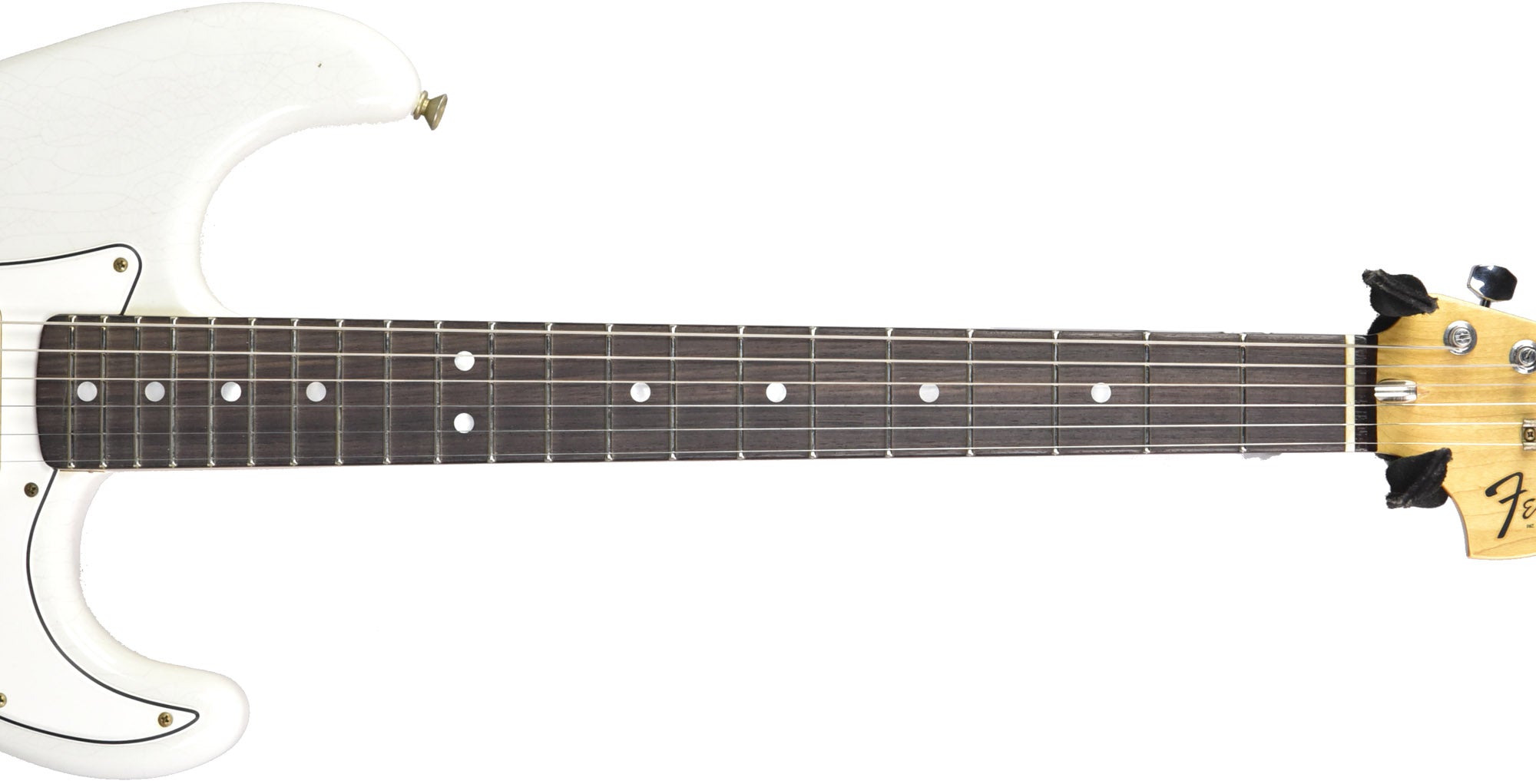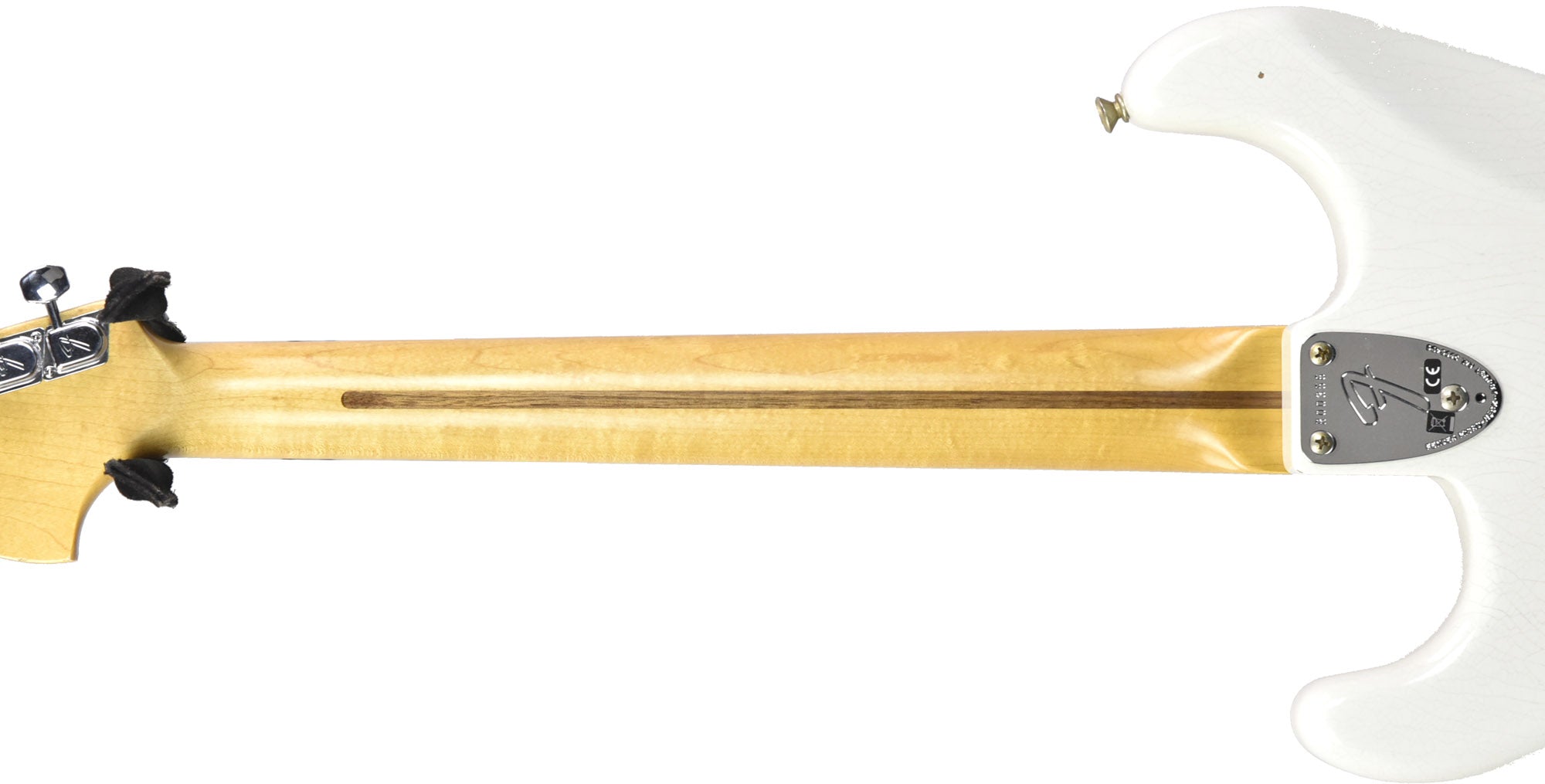 The body is made of Alder and it's finished in Olympic White with a Journeyman Relic level of distressing on its nitrocellulose finish.