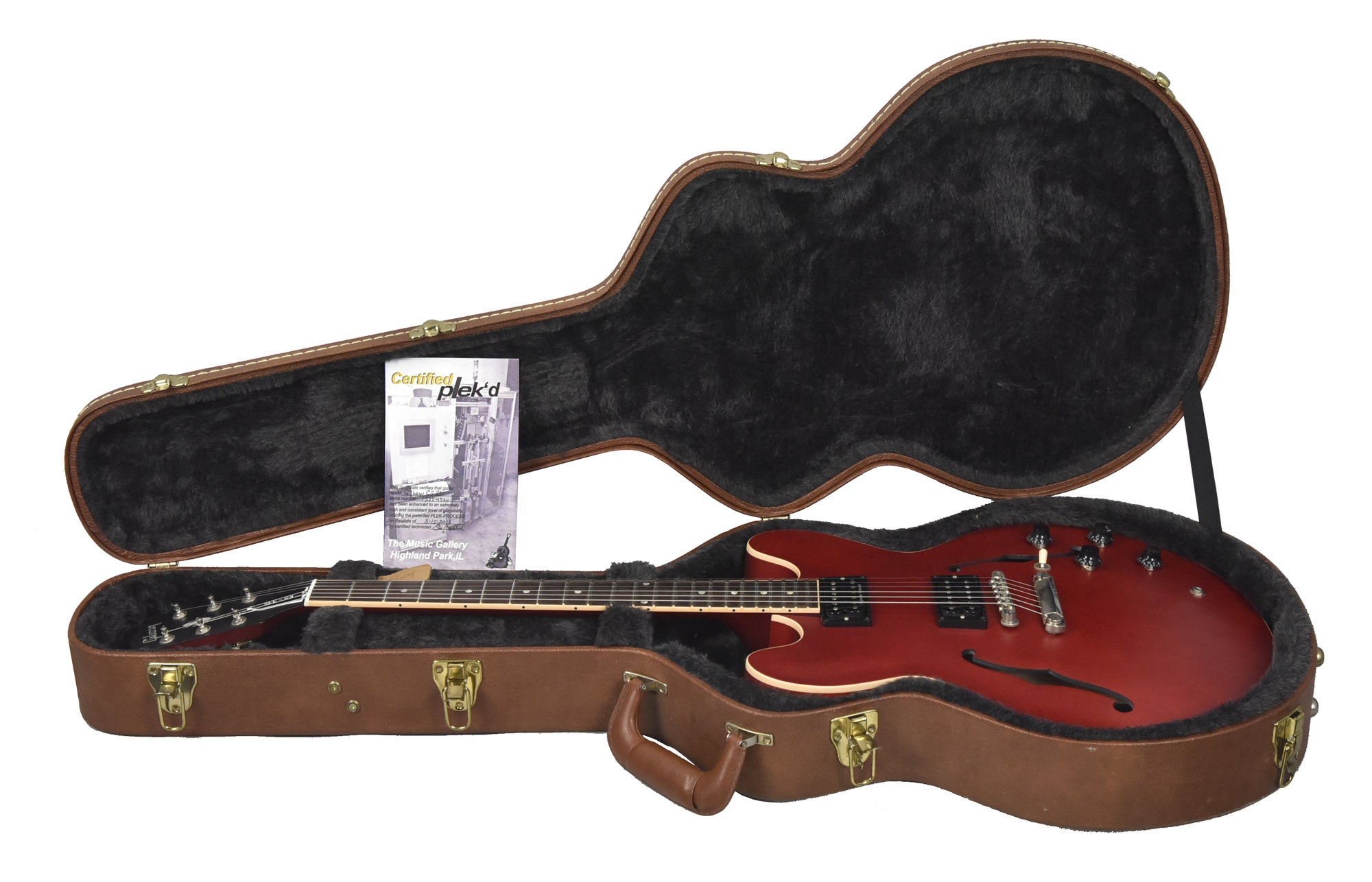 This Used 2014 Gibson Memphis ES-335 Semi-Hollow in Satin Cherry is here on consignment. The neck is fairly straight, the frets are still crowned, and the truss rod functions properly. Included with the guitar is the original hardshell case. It is missing its original pickguard, and we do not have it. There is a screw missing from the truss rod cover. The binding on the bass-side of the fingerboard up above the 12th fret is a bit rough, but you're not likely to ever come into contact with it. The neck pickup has been swapped to a Seymour Duncan Pearly Gates, and the neck pickup is a Seymour Duncan 59 Humbucker.