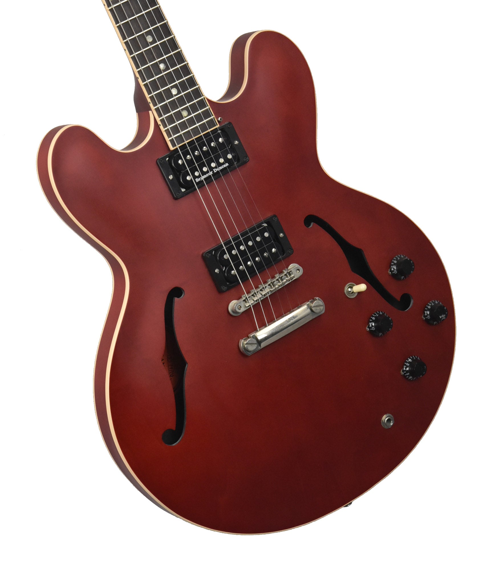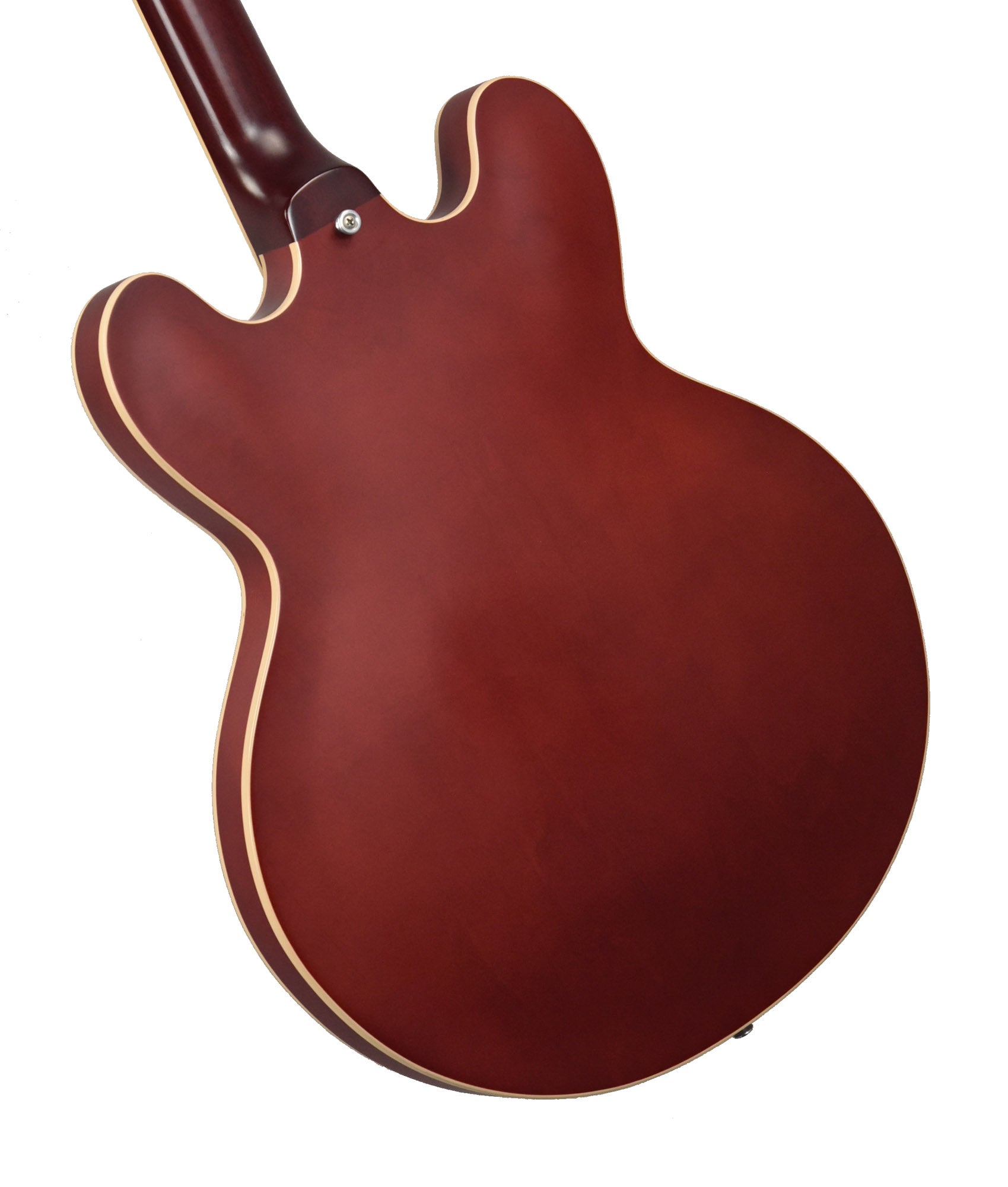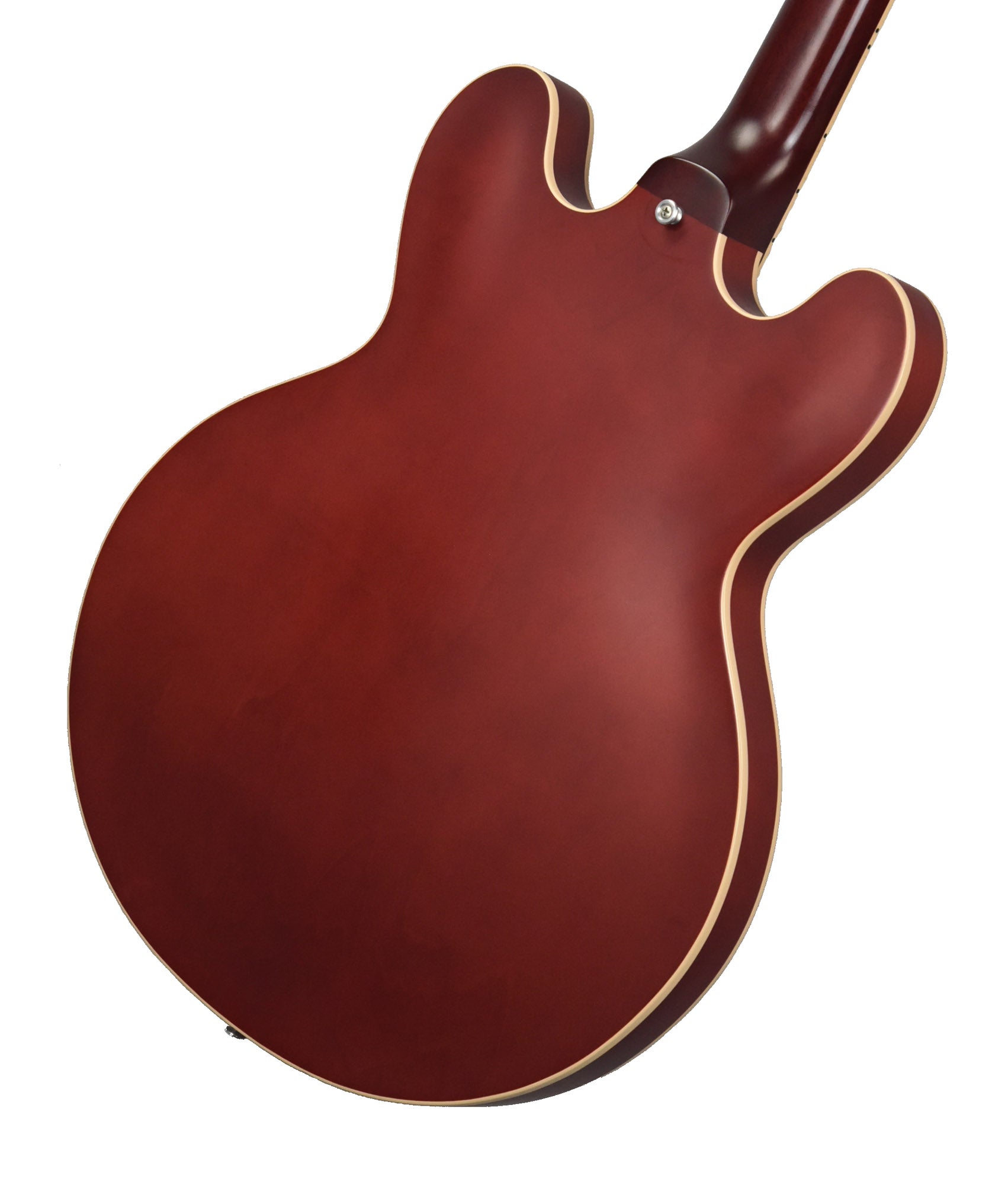 This is a normal ES-335 model in every way but one; it has a satin or matte finish. It features a semi-hollow body design with a center block, 2 humbuckers, laminate maple/poplar/maple body material, and set neck design. The satin finish takes much less time to execute, so these guitars are more affordable than their full gloss brethren.