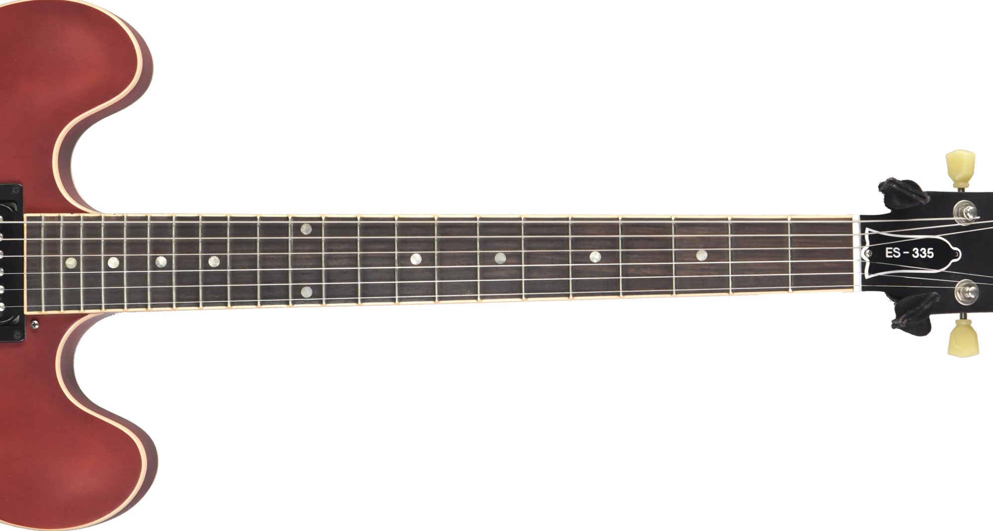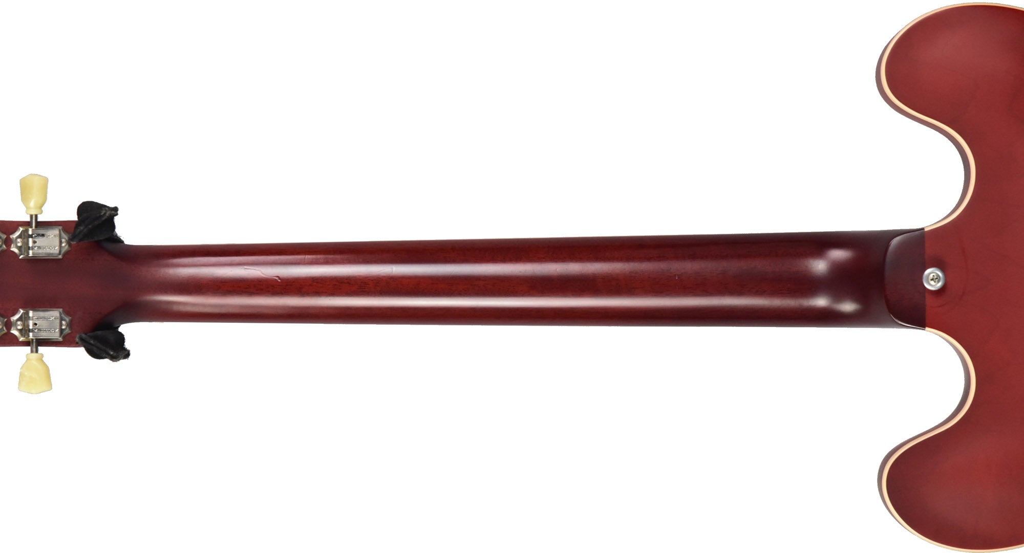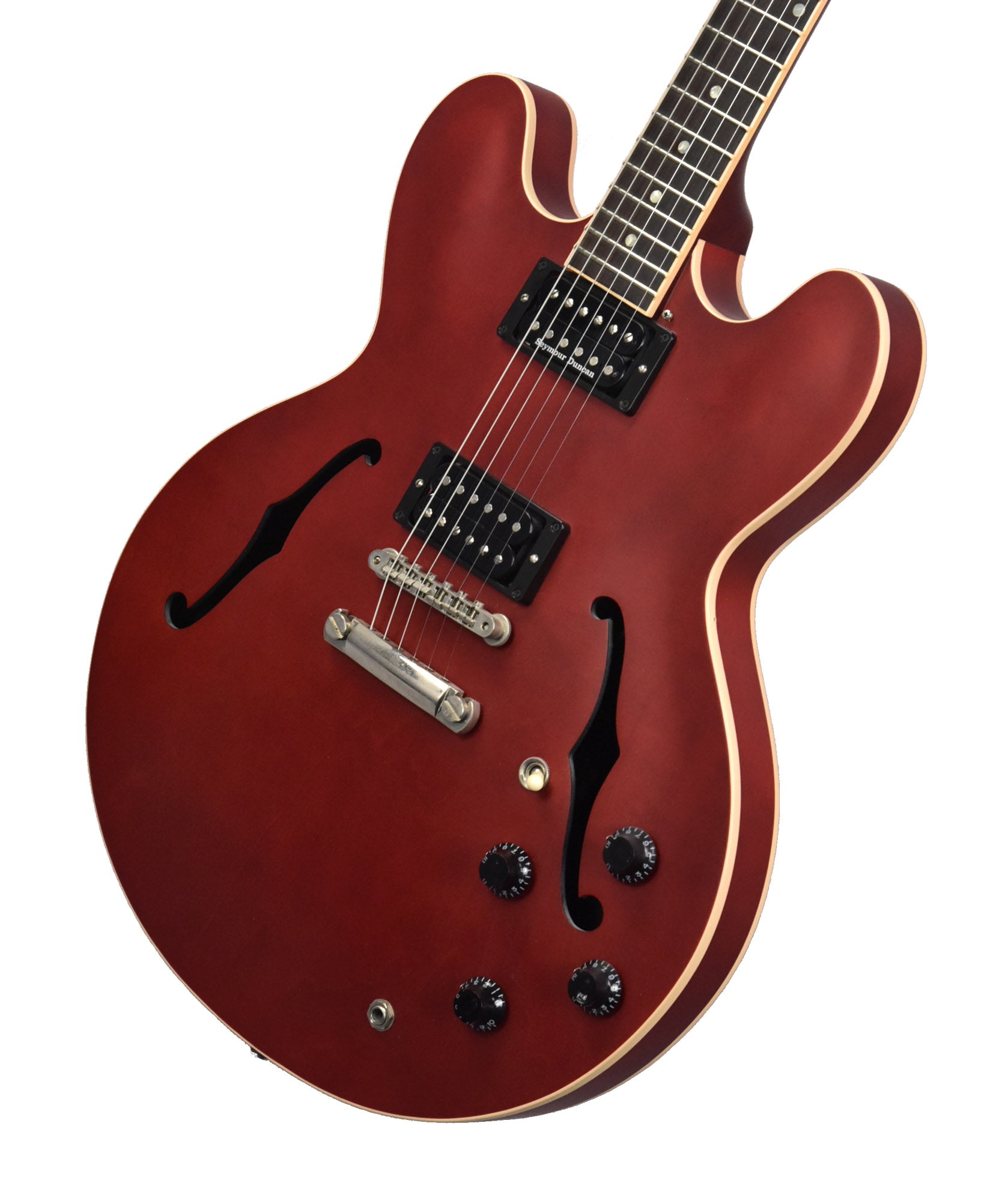 This is a normal ES-335 model in every way but one; it has a satin or matte finish. It features a semi-hollow body design with a center block, 2 humbuckers, laminate maple/poplar/maple body material, and set neck design. The satin finish takes much less time to execute, so these guitars are more affordable than their full gloss brethren.