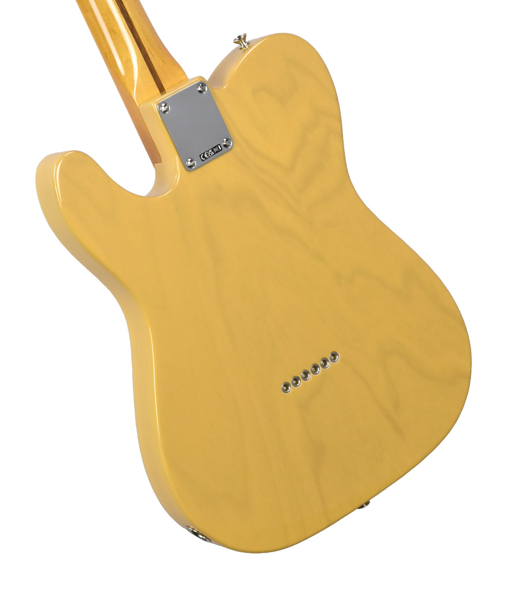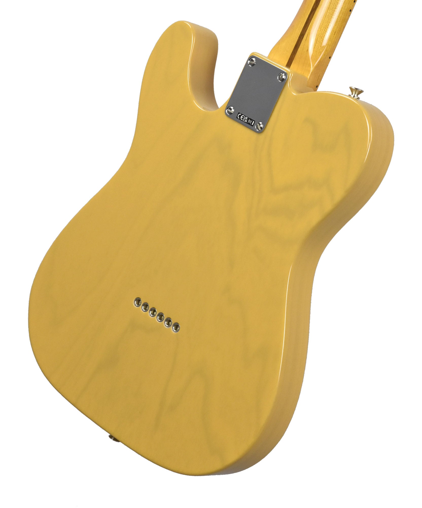 The American Vintage II 1951 Telecaster features an ash body finished in Butterscotch Blonde to capture the tone and look of the original. The substantial '51 "U"-shaped hard rock maple neck plays like a dream with a 7.25" radius fingerboard and vintage tall frets. Characteristic of production in 1951, 12th fret face-dot spacing is narrow and the sole Phillips-head fastener on the guitar is at the truss rod nut. The triple brass saddle bridge, single-line "Fender Deluxe" tuners and Pure Vintage '51 Telecaster pickups deliver classic twang and authentic Fender style.