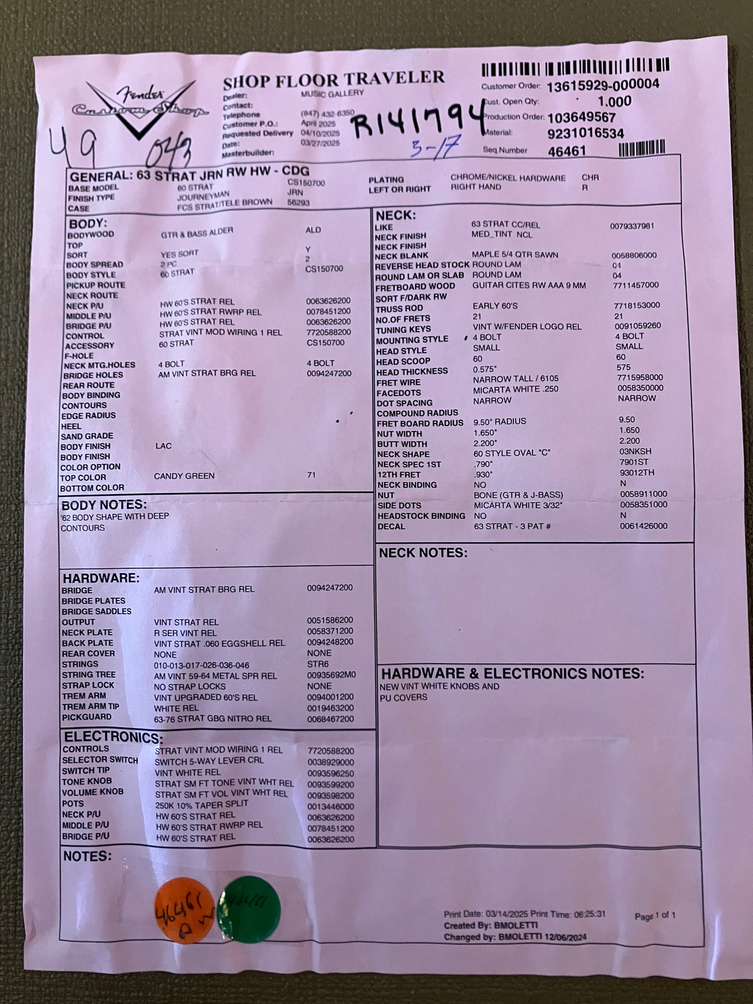 Neck: A quarter-sawn maple neck with a beautiful AAA rosewood fingerboard. Quarter-sawn maple is all about stability—it’s super rigid, which means fewer adjustments for you, even with its slender '60s Oval C profile. The AAA-rated rosewood fingerboard is hand-selected for its stunning darkness, a testament to the Fender Custom Shop's top-notch wood stash. A comfy 9.5" fingerboard radius and Sanko 6105 frets create a buttery-smooth playing surface. The nut width is 1.650" and the classic scale length is 25.5".
