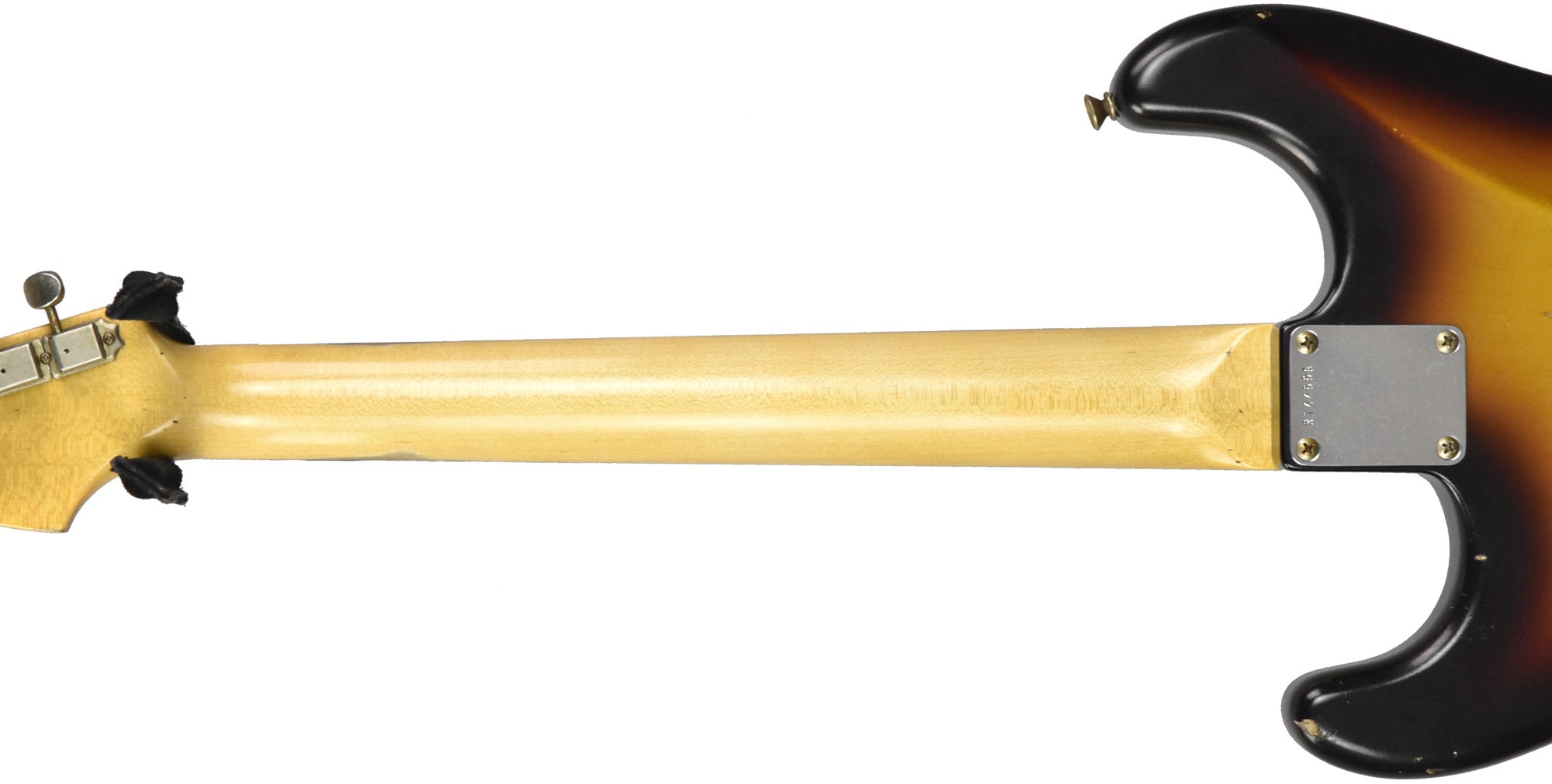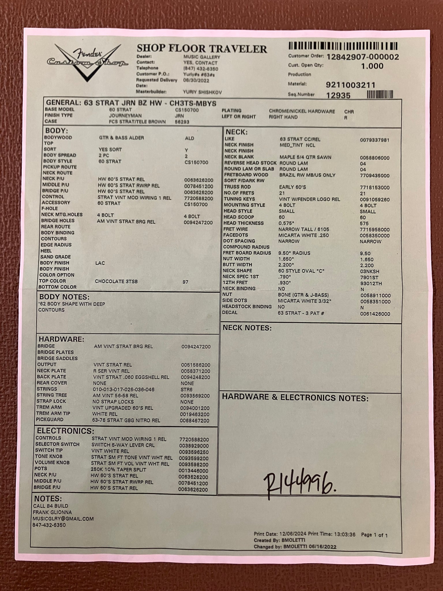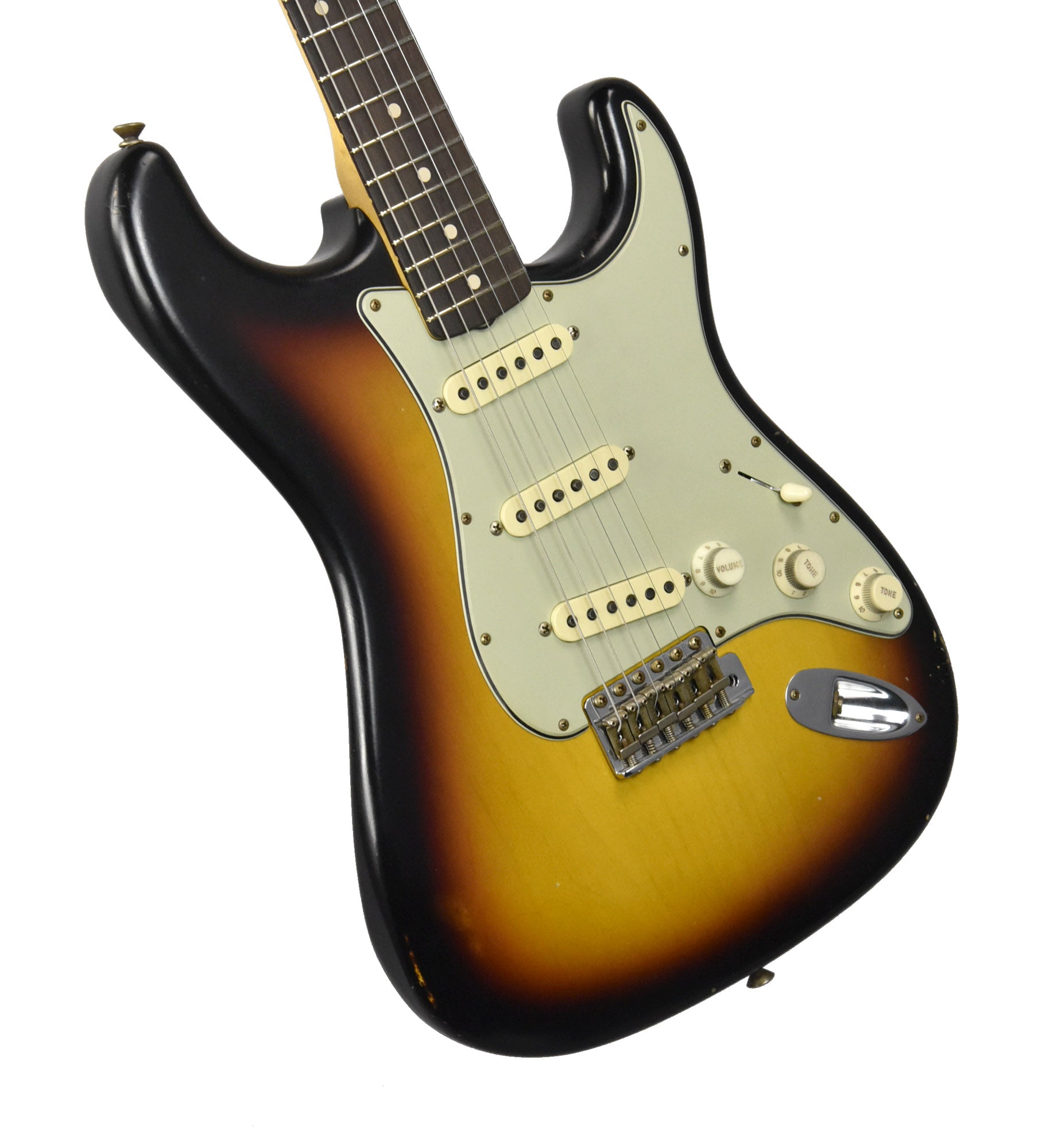 This Fender Custom Shop Masterbuilt 63 Stratocaster Journeyman Relic by Yuriy Shishkov in Chocolate 3 Tone Sunburst is brand new and includes its original hardshell case, certificate of authenticity, and manufacturer's warranty.