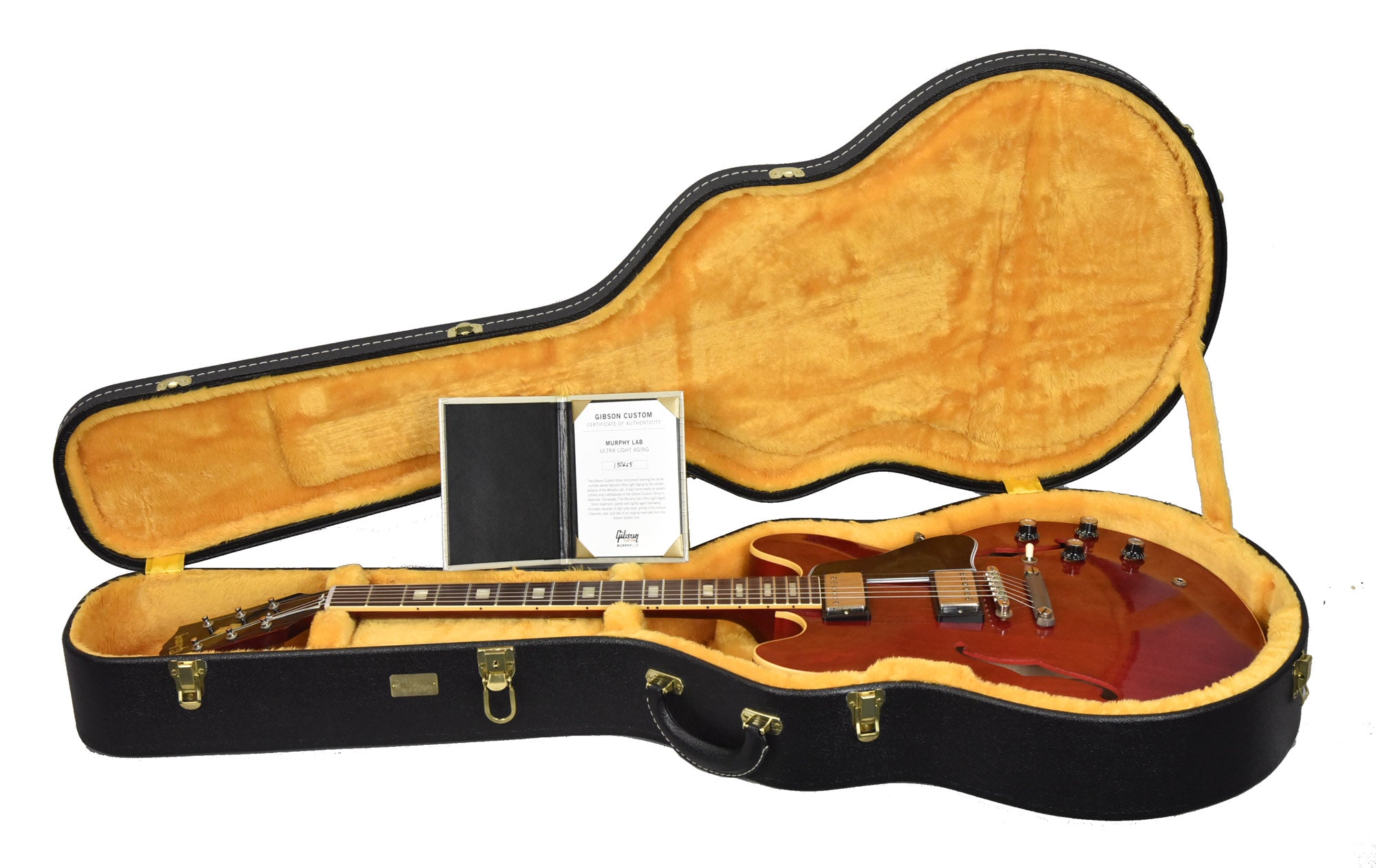 This Gibson Custom 1964 ES-335 Reissue Murphy Lab Ultra Light Aged in Sixties Cherry is brand new and includes its original hardshell case, certificate of authenticity, and manufacturer's warranty.