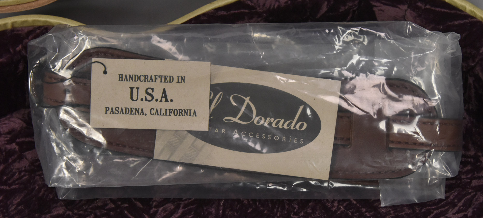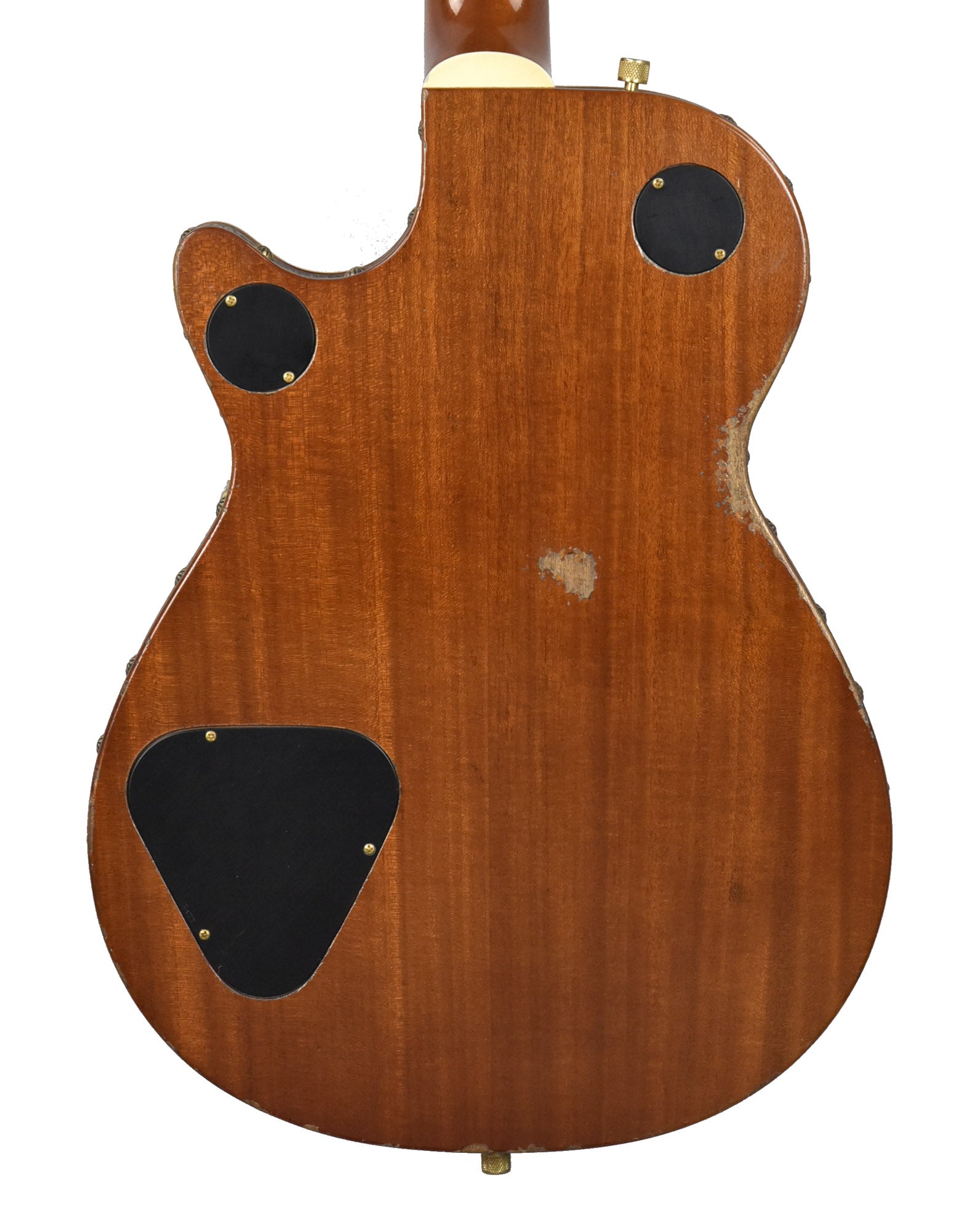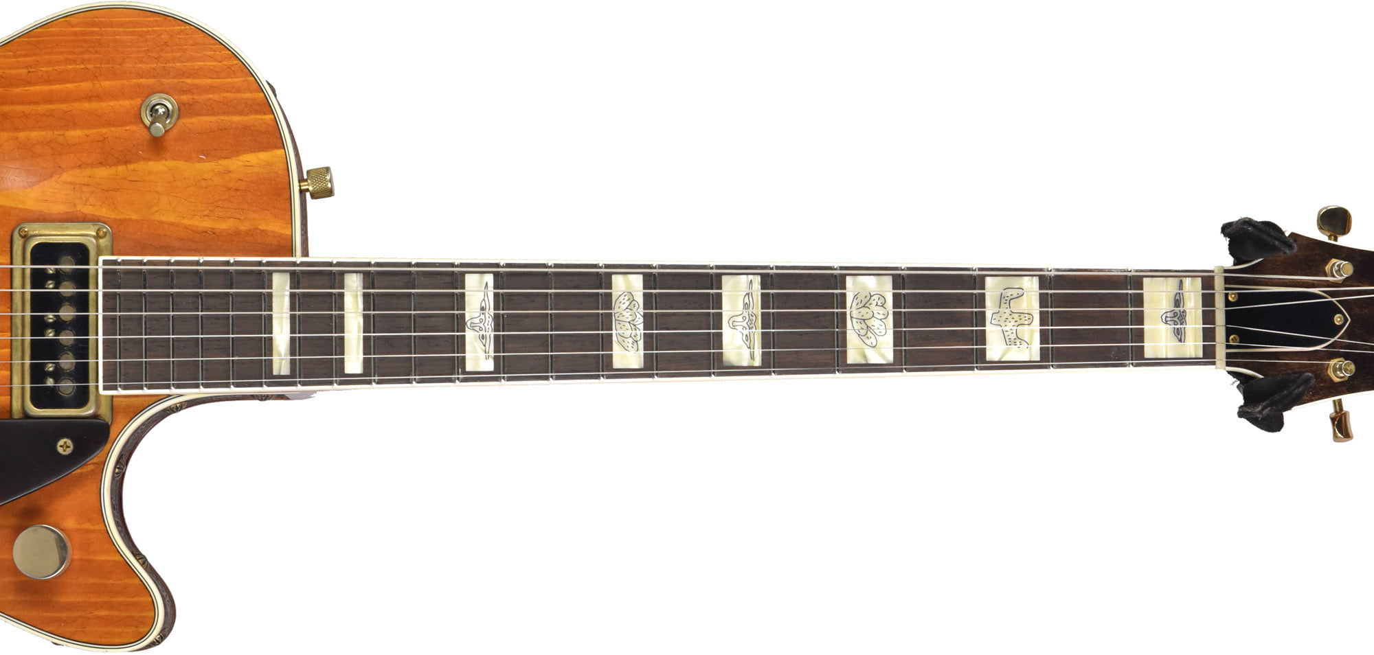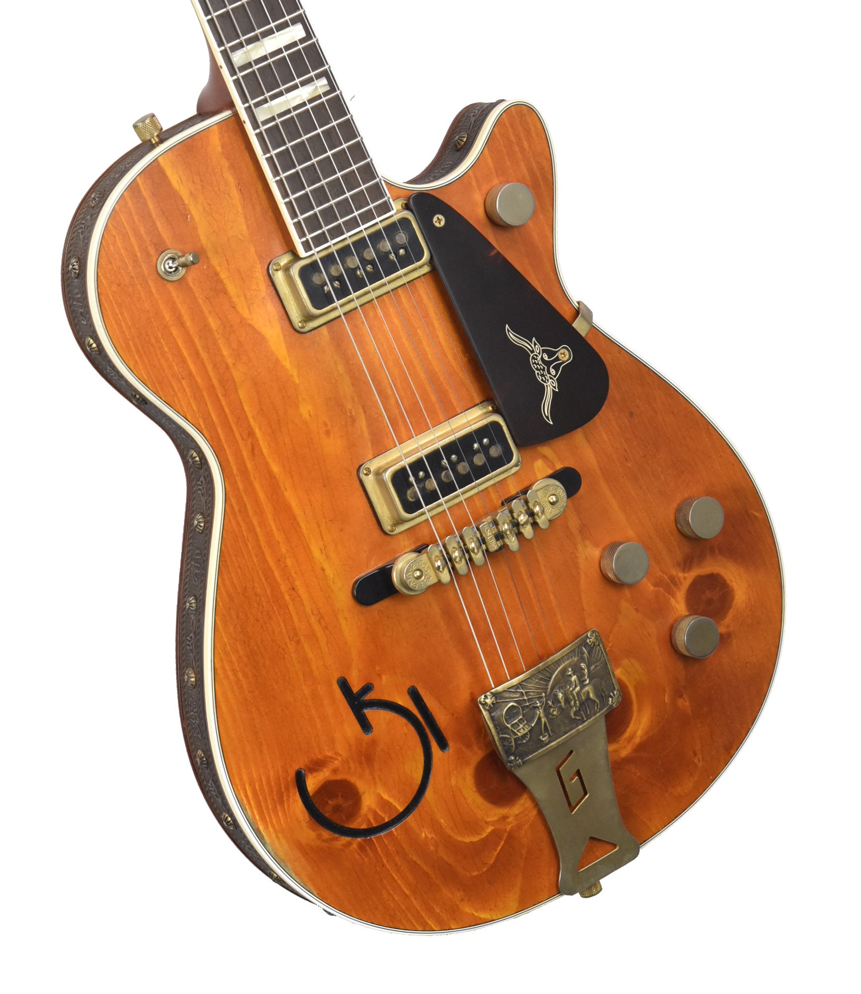 The top of this guitar is quite striking. Firstly, it's made from Knotty Pine, which gives it a unique look. It is sprayed in Faded Gretsch Orange for a worn look. It has the Large Black "G Brand" on the bass side, bought as if to say, "This Steer is ALL Gretsch!" You'll notice an interesting face to the tailpiece, which is actually a belt buckle! The strap of the studded belt was then expertly inlaid around the sides/edge of the guitar perfectly. This is an ex