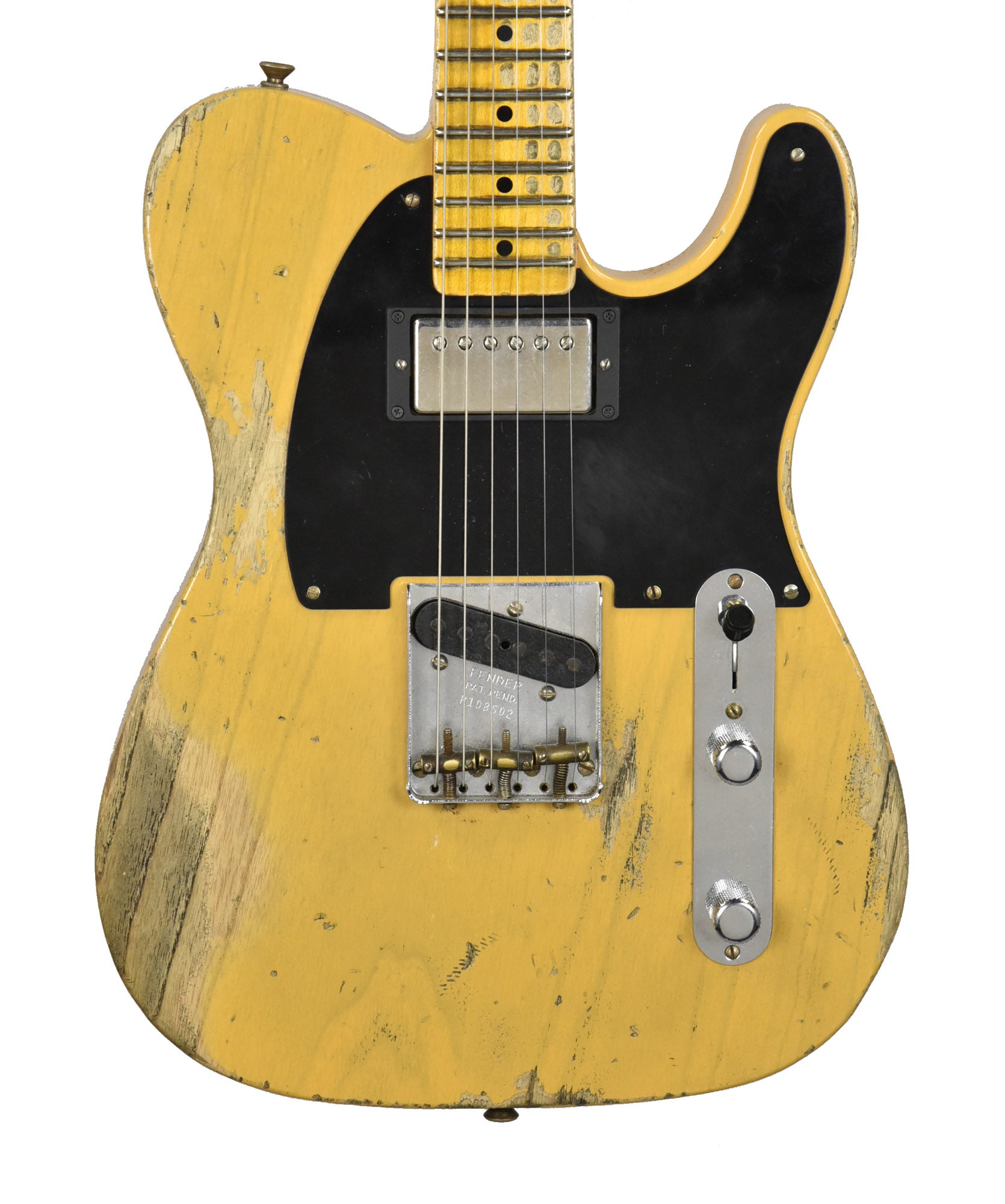 This slick, early 50s Tele features a Seymour Duncan Seth Lover humbucker in the neck position, mounted in a pickup ring. This pickup turns a Tele from being a bit muted and dull, to being thick and robust-sounding with a penchant for overdrive and gain. Paired with the Crushed Blackguard Bridge pickup, which clucks and struts with the best of 'em, you have a sonically versatile guitar with what some would argue provides the best of both tonal worlds.