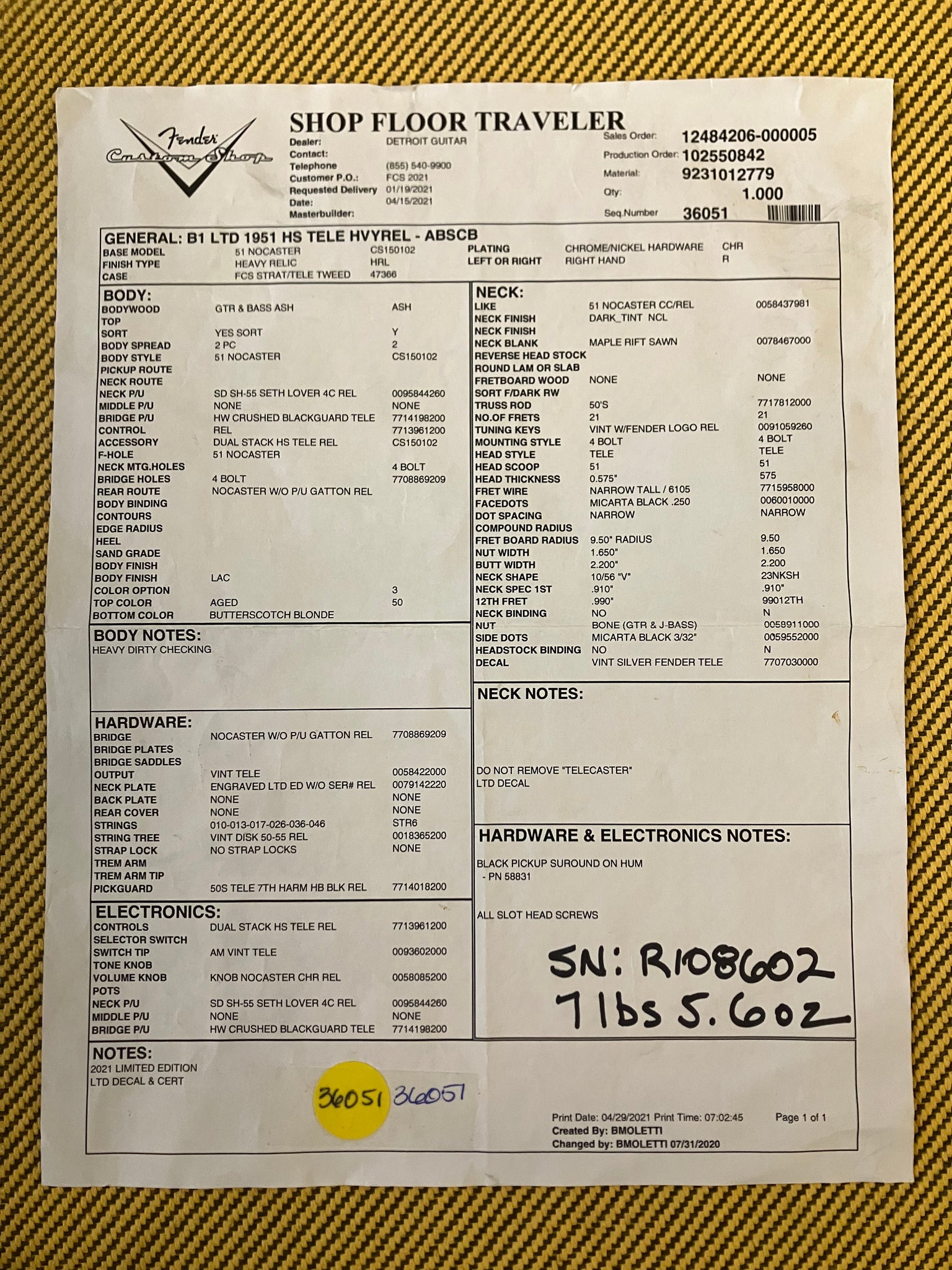 It features a 10/56 Profile that is on the large side. Measuring in at .91" at the 1st fret and .99" at the 12th, this is one of the larger 10/56 necks we've seen in recent memory. It also features 6105 frets and a 9.5" fingerboard radius for an updated fingerboard feel. The back of the neck is stripped of lacquer, and the fingerboard has that fairly worn and dirty look you'd expect to see on a Heavy Relic.