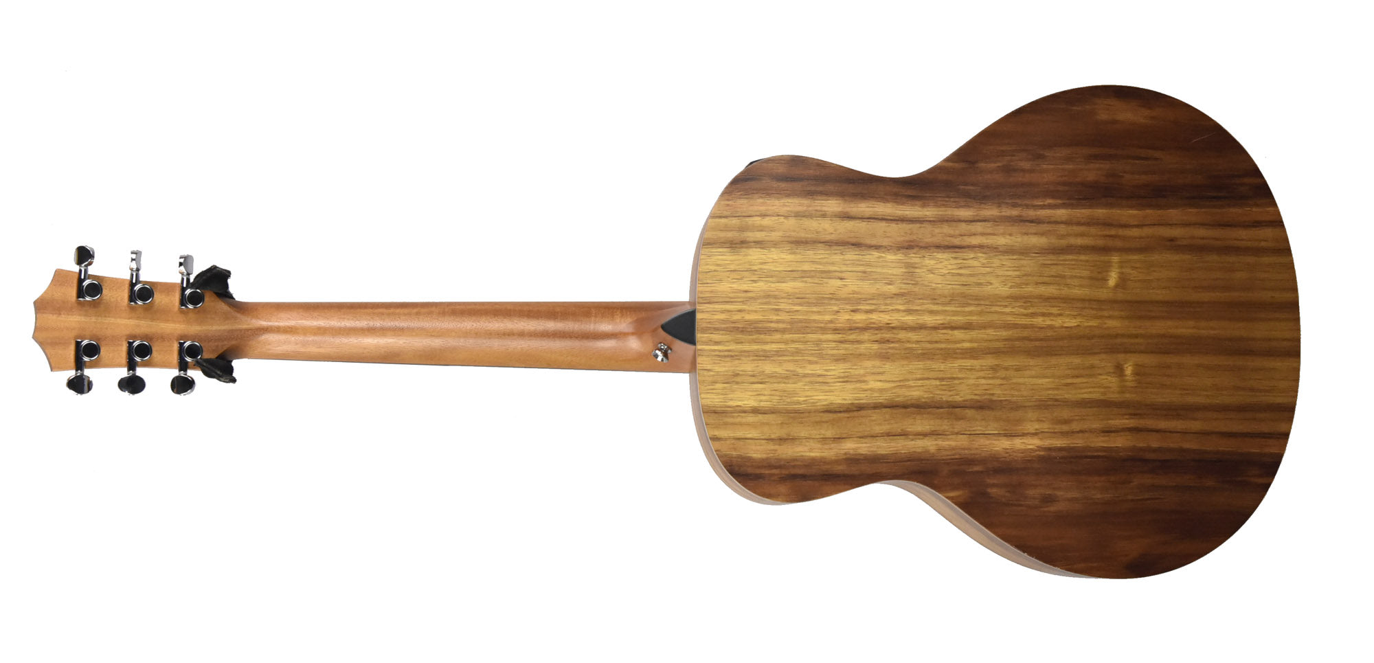 The GS Mini-e Koa brings the vibrant sound and organic beauty of Hawaiian koa to Taylor's ultra-popular reduced-scale acoustic guitar. The GS Mini's compact proportions make it a great choice for players who take their music on the road, and with a solid koa top, this model serves up a rich, bold sound that punches well above its weight for a smaller guitar. The built-in ES-B pickup offers clear, natural amplified tone and includes a digital tuner with an easy-to-read LED display. The GS Mini-e Koa ships with a structured gig bag.