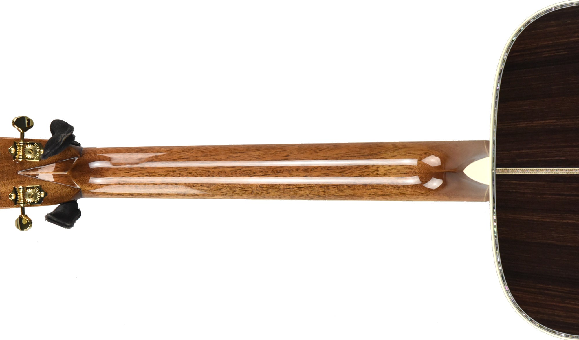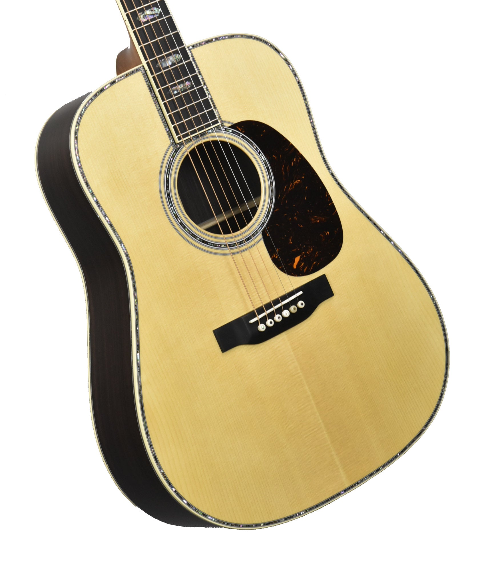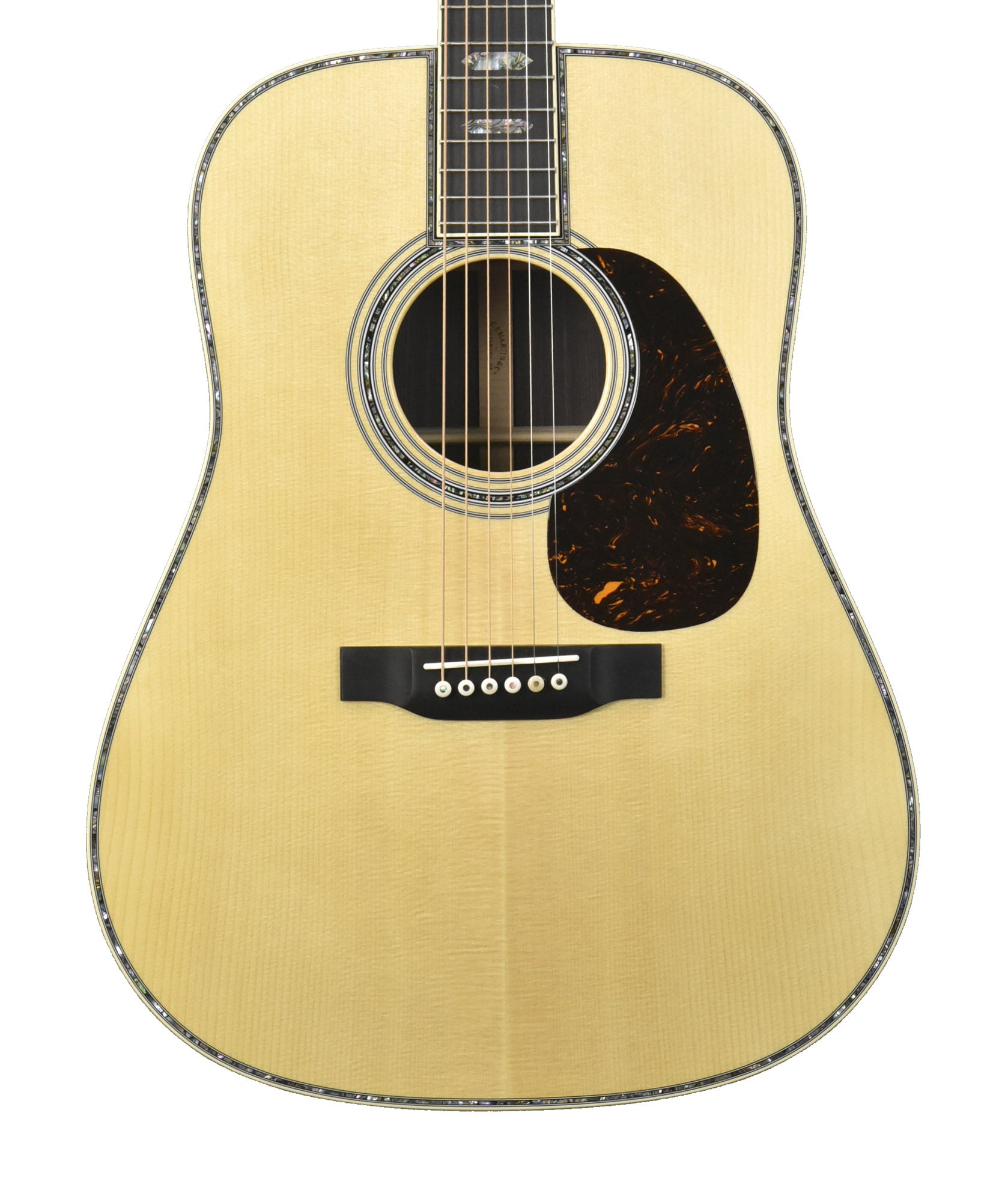 The neck is made from Genuine Mahogany and is shaped to Martin's Modified Low Oval Profile with their High-Performance Taper. This is a very comfortable and easy neck to play, even for extended periods of time. The fingerboard is made from Ebony which has the large 45-Style Hexagonal Inlays made of Abalone for an absolutely striking look. Bright, iridescent colors explode from the inlays, accentuated further by the black Ebony fingerboard. The fingerboard is bound with Antique White binding, completing its High-End look perfectly.
