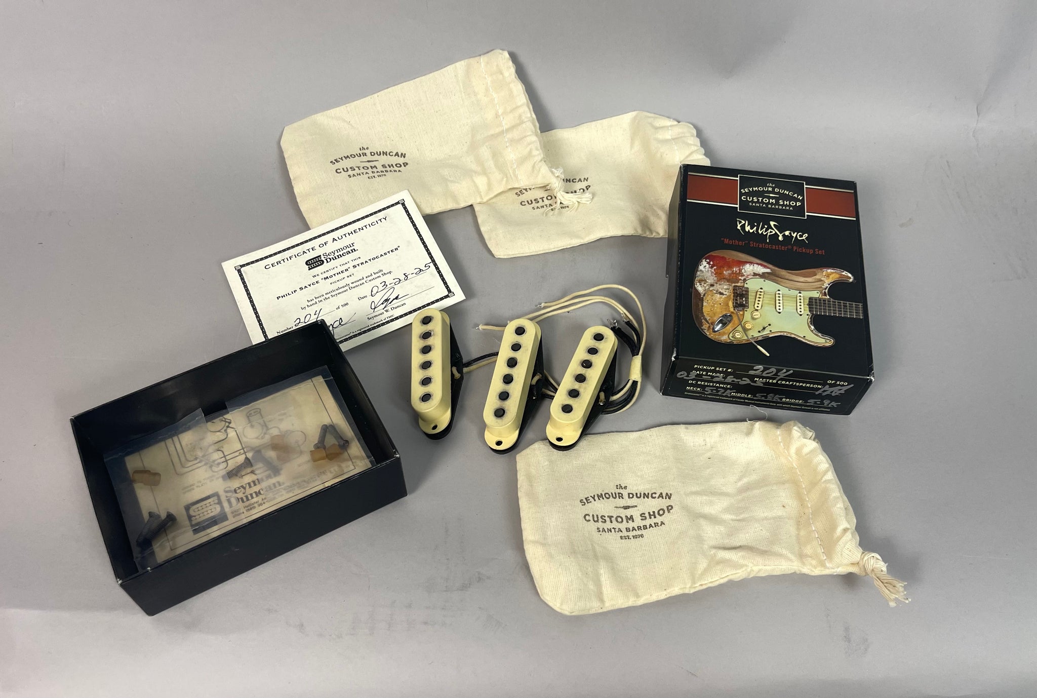 This Seymour Duncan Philip Sayce Stratocaster pickup set was a limited run from the Seymour Duncan Custom Shop. This is set 204 of 500, along with the certificate. These came to us in a trade so they have custom-aged Fender Road Worn pickup covers not the original Duncan covers.